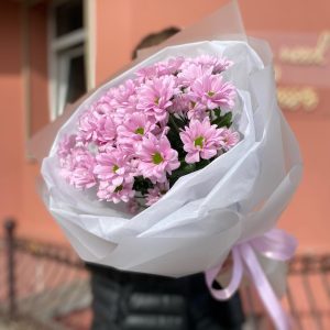 Букет из трёх хризантем и цветной гипсофилы с зеленью